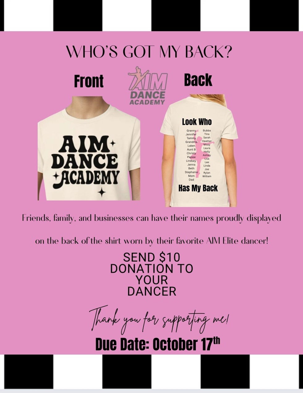 Supporting the Elite Team through the “Who’s Got My Back?” fundraiser is more than just helping cover competition fees and costume costs — it’s showing our dancers that their community is behind them every step of the way. Each name or business printed on the back of their shirts is a reminder of the love, encouragement, and belief in their hard work and dedication. By giving, you’re not only investing in their dance journey, but also in their confidence, growth, and memories that will last a lifetime.
