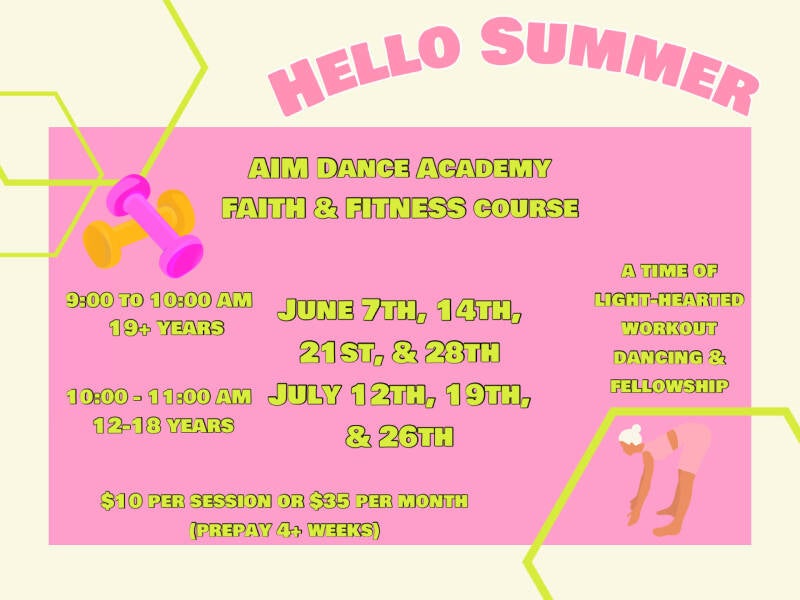 AIM Dance Academy is offering a faith & fitness course this summer. Two different ages groups get together every Saturday for fellowship & Zumba inspired dance movements!